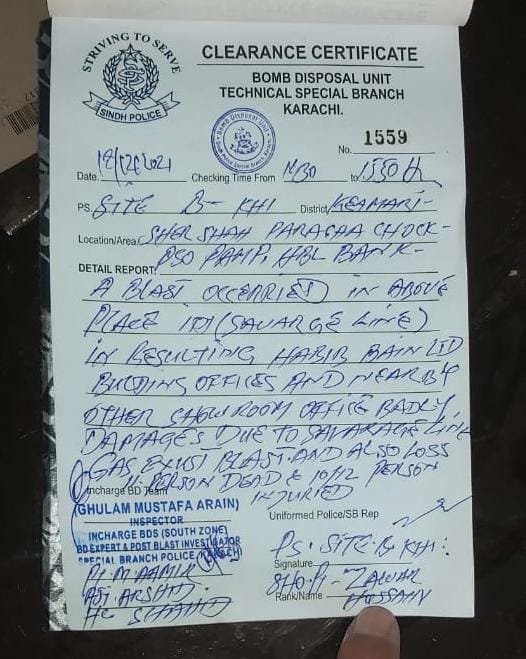 بم ڈسپوزل اسکواڈ کی جاری کردہ رپورٹ کے مطابق دھماکہ گسس بھر جانے کے باعث ہوا جب کہ واقعے مںا دہشتگردی سمتہ کسی قسم کی تخریب کاری کے شواہد ابھی تک نہیں ملے۔