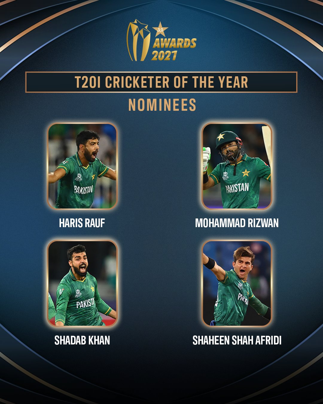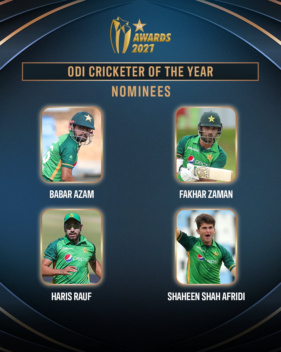 ون ڈے کرکٹ آف دی ایئر کیلئے پاکستان ٹیم کے کپتان بابراعظم، فخرزمان، حارث رؤف اور شاہین آفریدی کو شارٹ لسٹ کیا گیا ہے۔