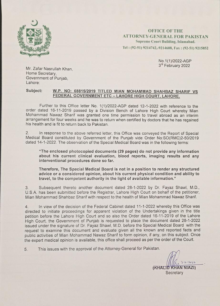 اٹارنی جنرل نے خط میں کہا کہ میڈیکل بورڈ کی رائے کے بعد اٹارنی جنرل آفس شہباز شریف کے خلاف کاروائی کے لیے آئندہ کا لائحہ عمل طے کرے گا۔