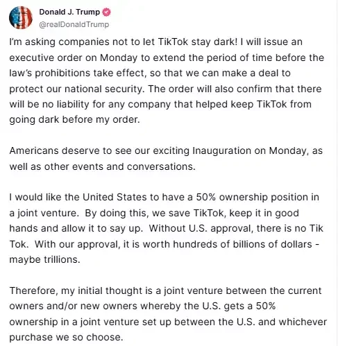 Trump said he would revive TikTok access in the US by executive order after he is sworn in on Monday, but said he wants the popular social media app to be at least half owned by US investors.