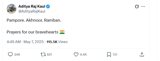 Pro-BJP Indian journalist Aditya Raj Kaul tweeted in the wee hours of Wednesday, “Pampore. Akhnoor. Ramban. Prayers for our bravehearts,” hinting at heavy losses of Indian military.