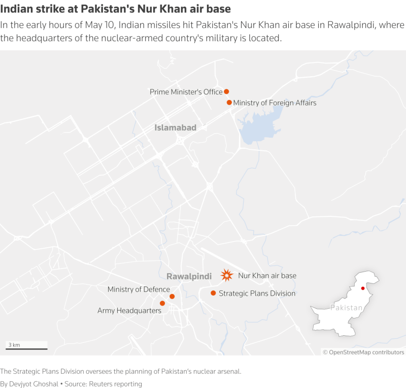The critical eight-hour window also saw Indian missile barrages on three major Pakistani air bases and other facilities, including Nur Khan, which is ringed by civilian homes like Subhan’s, and just a 20-minute drive to the capital, Islamabad.
