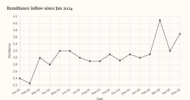 Remittances increased by 13.7% year over year, compared to $3.24 billion recorded in the same month last year. On a monthly basis, remittances were up 16%, compared to $3.18 billion in April.
