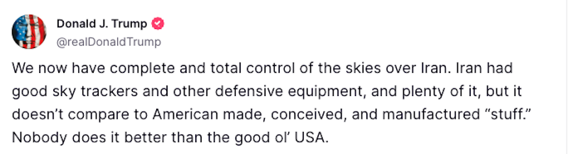 ‘Complete and total control’ of Iranian skies thanks to American ‘stuff’
