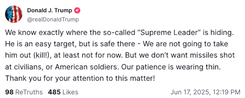 “We know exactly where the so-called ‘Supreme Leader’ is hiding. He is an easy target, but is safe there – We are not going to take him out (kill!), at least not for now,” Trump said on Truth Social.