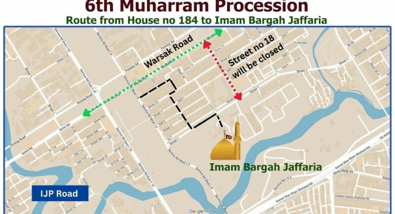 According to an ITP official, the procession will begin from Street 22 and culminate at Imambargah Jafriya in Sector I-9/1. In view of the procession, the service road adjacent to I-9/1 will remain closed to all types of traffic for the duration of the event.