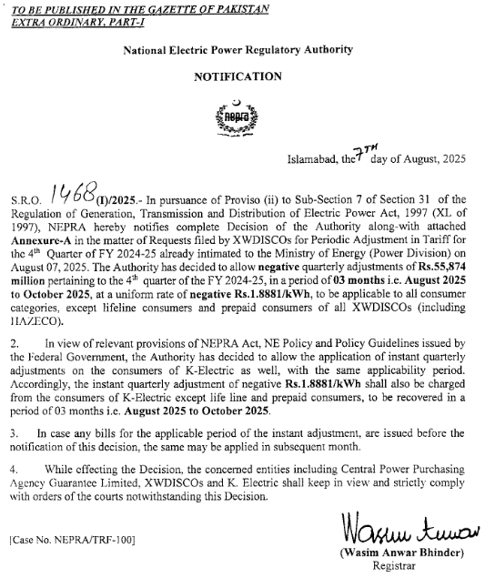 According to NEPRA’s decision, the reduction will apply to all consumers of power distribution companies (DISCOs), including K-Electric.