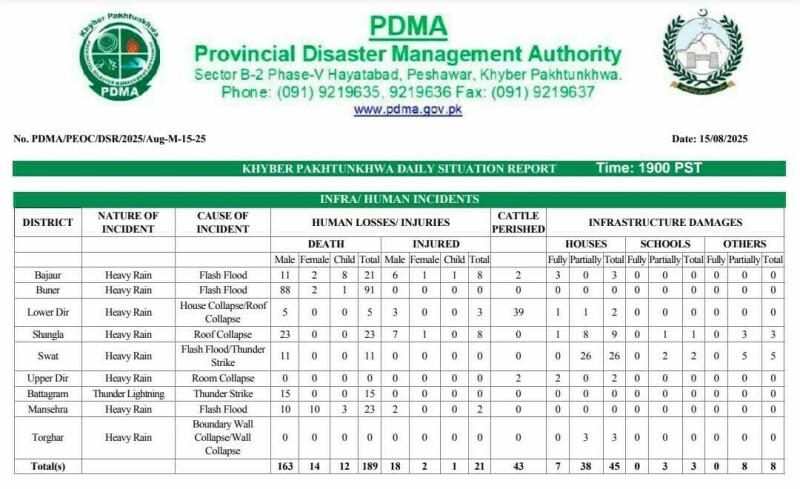 A flood emergency has been imposed in Buner to manage the crisis, while the Pakistan Meteorological Department (PMD) warns the current spell of heavy rainfall is likely to continue intermittently until August 21.