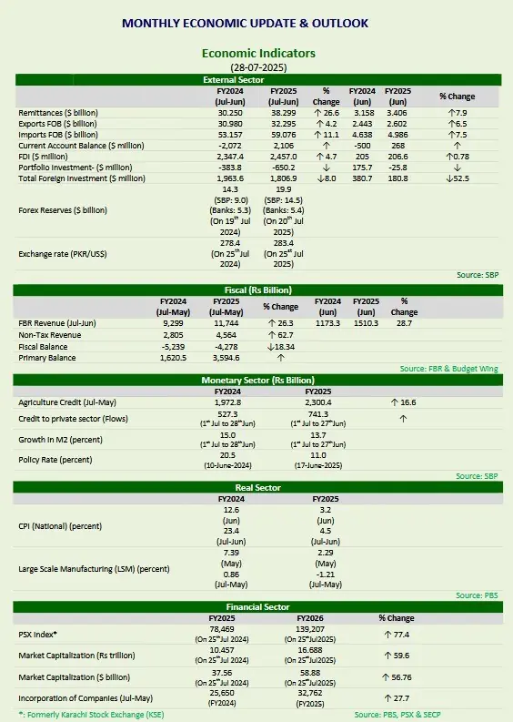 “Pakistan’s economy started FY2026 with positive developments from the sustained improvements in FY2025 and setting a promising tone for the months ahead,” says the monthly update and outlook for August 2025.