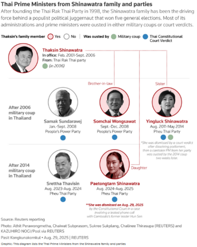 Paetongtarn, who was Thailand’s youngest prime minister, becomes the sixth premier from or backed by the billionaire Shinawatra family to be removed by the military or judiciary in a tumultuous two-decade battle for power between the country’s warring elites.