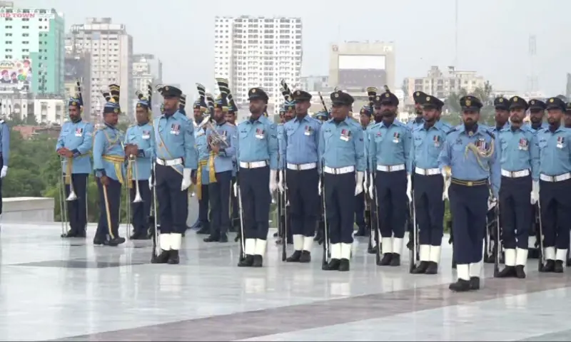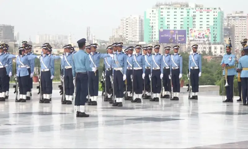 Cadets from the Pakistan Air Force Academy assumed guard duties at Mazar-e-Quaid.