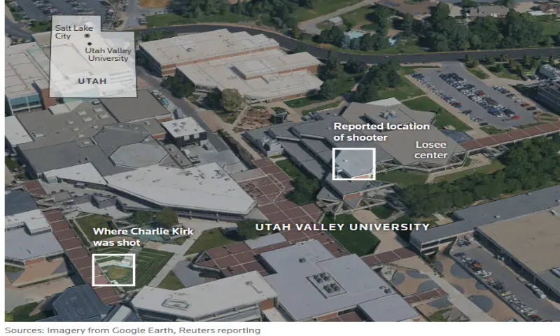 FBI and state officials said the killer arrived on the campus a few minutes before the event began, a talk by Kirk titled “Prove Me Wrong” outdoors in front of about 3,000 people at Utah Valley University in Orem, Utah, about 40 miles (65 km) south of Salt Lake City.