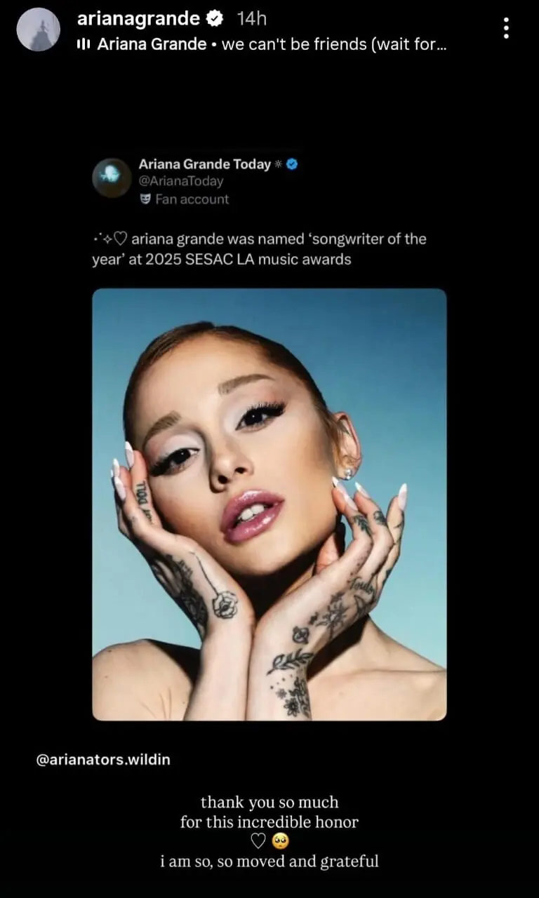 Ariana Grande has added another accolade to her impressive career, winning the “Songwriter of the year award” at the 2025 SESAC Latina Music Awards.
