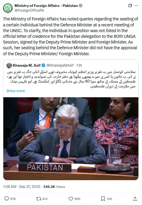 Clarifying further, the Foreign Office stated: “The individual in question was not listed in the Letter of Credence for Pakistan’s delegation to the 80th General Assembly session, which was signed by the deputy prime minister and foreign minister. Therefore, her seat behind the defence minister was not approved by the deputy prime minister and foreign minister.”