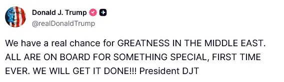 The United States President Donald Trump anticipated a real chance – “GREATNESS IN THE MIDDLE EAST”, in his latest statement on Truth Social.