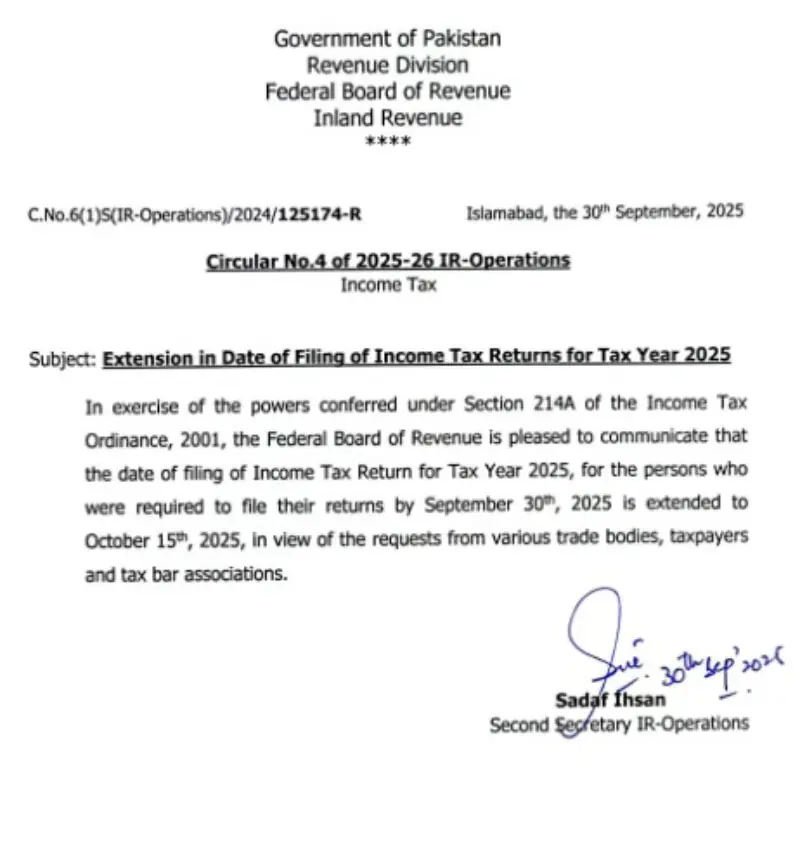 The Federal Board of Revenue (FBR) late Tuesday announced a 15-day extension in the deadline for filing income tax returns, allowing taxpayers to submit their returns until October 15, 2025.