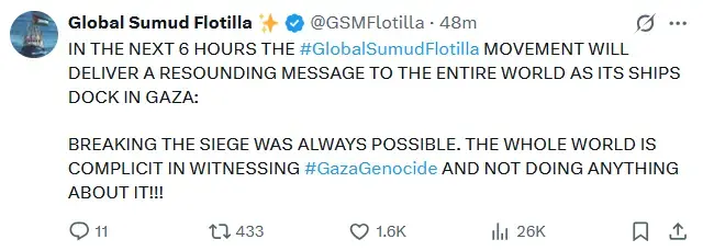 Despite the interception, flotilla organisers vowed to continue their campaign, urging worldwide protests. On its official X account, the movement said: In the next six hours, the Global Sumud Flotilla movement will deliver a resounding message to the entire world as its ships dock in Gaza: Breaking the siege was always possible. The whole world is complicit in witnessing the Gaza genocide and not doing anything about it!!!