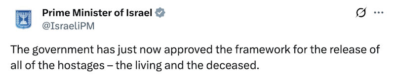 “The government has just now approved the framework for the release of all of the hostages – the living and the deceased,” Israeli Prime Minister Benjamin Netanyahu’s English-language X account said.