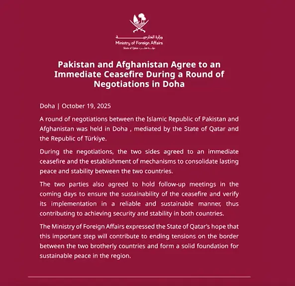 Afghanistan and Pakistan have agreed to an immediate ceasefire during talks hosted by Doha, Qatar’s foreign ministry announced early on Sunday, after the South Asia neighbours extended a ceasefire following a week of fierce border clashes.