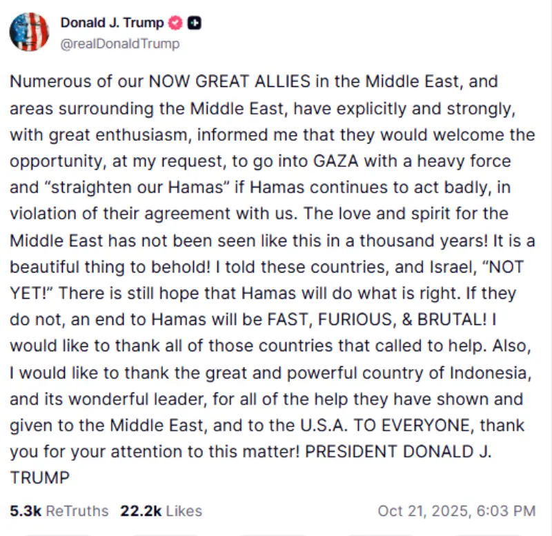 US President Donald Trump threatened Hamas on Tuesday with “FAST, FURIOUS & BRUTAL” force if it does not “do what is right” as he pushes for the next, more complex, stage of a Gaza ceasefire that has already been repeatedly tested.