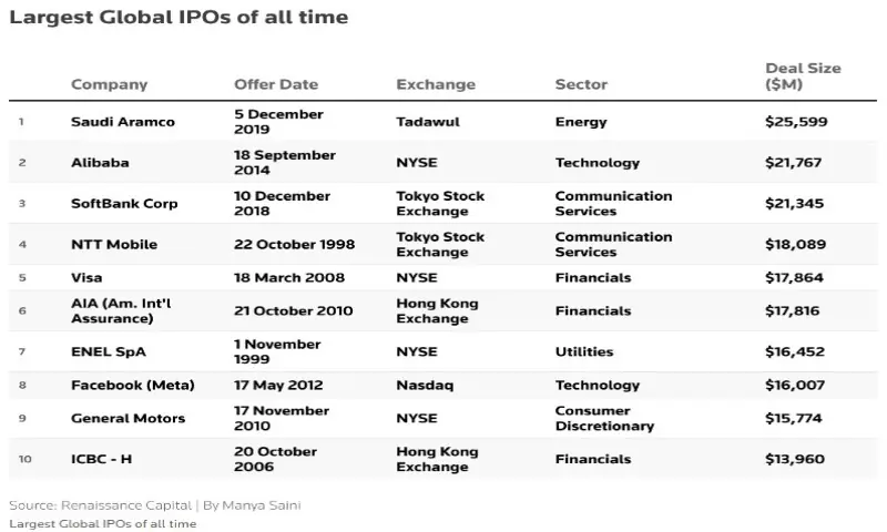 Saudi Aramco is the only completed IPO to achieve a more than $1 trillion valuation. The state-owned petroleum and natural gas giant debuted in December 2019 with an estimated market capitalisation of $1.7 trillion.