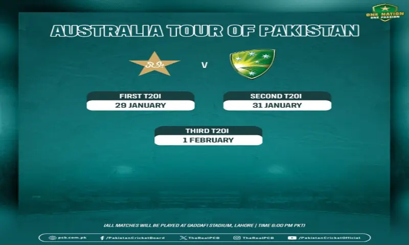 The Pakistan Cricket Board has announced the dates for Australia’s T20I tour of Pakistan, with the first match scheduled to be held on January 29.